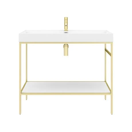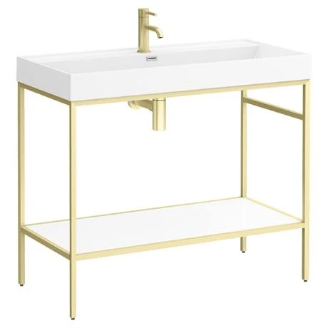 Create a modern, minimalist atmosphere in your bathroom with this large Arezzo Brushed Brass Framed Washstand. This 1005mm wide, thin edged basin provides plenty of space for washing and its gloss white polymarble construction contrasts beautifully with the durable brushed brass aluminium frame. The open shelf beneath the basin offers ample storage room for your toiletries, while the Arezzo washstand has an integrated towel rail to keep the sink area neat. This floor standing unit arrives preassembled so it’s easy to install. Go for a coordinated look with the Arezzo Brushed Brass Basin Mixer.