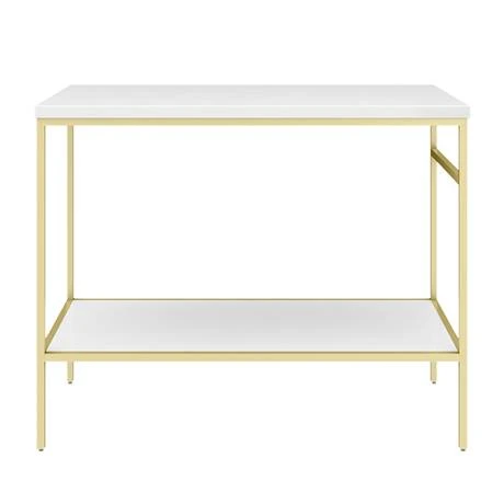 The smart space-saving Arezzo 1010mm wide stone resin gloss white worktop with brushed brass washstand for use counter top basins, brings minimalist luxury to your space with its striking brushed brass lines and cool, gloss white components. The brushed brass framed washstand has an open shelf for storing and displaying your favourite cosmetics, as well as a convenient integrated towel rail. Complete the look with one of our stylish counter top basins, brushed brass basin taps and exposed bottle traps (not included).