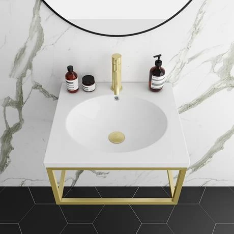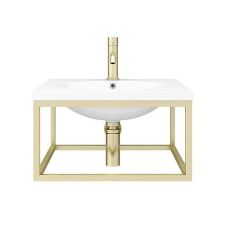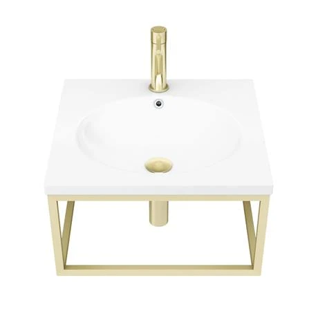 The smart and space-saving Arezzo 500mm wall mounted basin comes complete with a supporting brushed brass steel towel rail frame, perfect for creating a stunning, fashionable and chic bathroom interior.Â