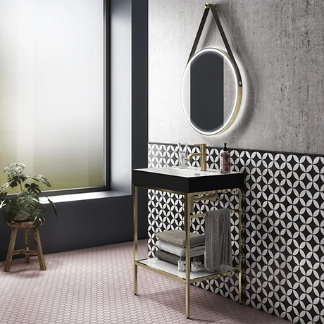 Create a hotel worthy bathroom with the Arezzo Framed Washstand. This freestanding unit brings minimalist luxury to your space, with its striking brushed brass lines and cool, gloss white components. The luxury brushed brass framed washstand has an open shelf for storing and displaying your favourite cosmetics, as well as a convenient integrated towel rail. Its durable polymarble matt black and gloss white includes one tap hole and a thin, modern rim. Why not pair your Arezzo washstand with a coordinating Arezzo Round Brushed Brass Mixer Tap?