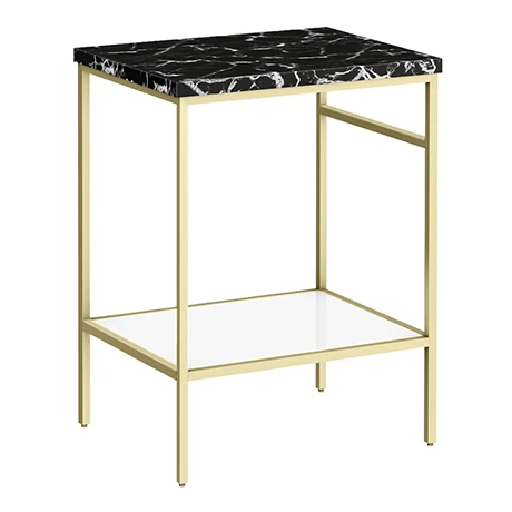 The smart space-saving Arezzo 610mm wide stone resin gloss black marble effect worktop with brushed brass washstand for use counter top basins, brings minimalist luxury to your space with its striking brushed brass lines and cool, gloss white components. The brushed brass framed washstand has an open shelf for storing and displaying your favourite cosmetics, as well as a convenient integrated towel rail. Complete the look with one of our stylish counter top basins, brushed brass basin taps and exposed bottle traps (not included).