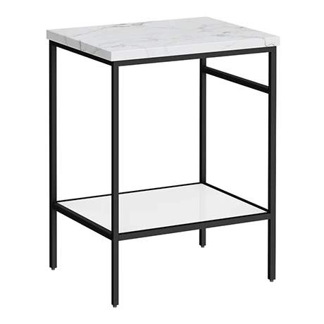 The smart space-saving Arezzo 610mm wide stone resin gloss white marble effect worktop with matt black washstand for use counter top basins, brings minimalist luxury to your space with its striking matt black lines and cool, gloss white components. The black framed washstand has an open shelf for storing and displaying your favourite cosmetics, as well as a convenient integrated towel rail. Complete the look with one of our stylish counter top basins, matt black basin taps and exposed bottle traps (not included).