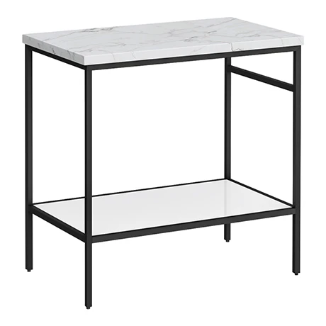 The smart space-saving Arezzo 810mm wide stone resin gloss white marble effect worktop with matt black washstand for use counter top basins, brings minimalist luxury to your space with its striking matt black lines and cool, gloss white components. The matt black framed washstand has an open shelf for storing and displaying your favourite cosmetics, as well as a convenient integrated towel rail. Complete the look with one of our stylish counter top basins, matt black basin taps and exposed bottle traps (not included).