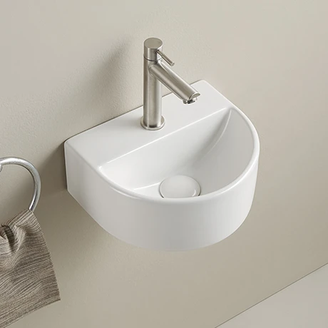 The stylish Arezzo round wall hung cloakroom basin, a high quality curved ceramic basin with a single tap hole and stunning gloss white finish. Provides you with a handy wall mounted space-saving solution for your cloakroom or en-suite. Some small dimensional variations may occur due to manufacturing tolerances. Waste not included. Complete the look with one of our stunning exposed bottle traps.
