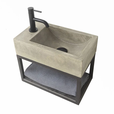 The space-saving rugged Arezzo Stone Natural Concrete wall hung cloakroom basin with matt black towel shelf, prefect for creating the perfect cloakroom. The Arezzo stone range encapsulates modern industrial design, provides you with a handy space-saving solution for your cloakroom or en-suite. Distinctive edges are divided by a sweeping natural curve making this miniature concrete basin a humble classic. Features a practical minimalist matt black towel shelf ideal, perfect for use where space is premium, freeing up as much precious floor space as possible. Waste and bottle trap not included.Â