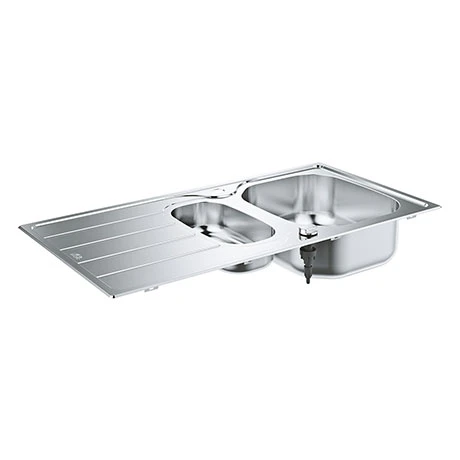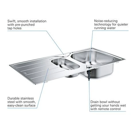 The Grohe K200 1.5 Bowl Stainless Steel Kitchen Sink has everything you need for a busy kitchen, plus clever features you’ll love. The sink has two pre-drilled tap holes, meaning that it is fully reversible. The sink offers plenty of internal space, with 1.5 bowls and a main bowl depth of 17.5cm, meaning even large pans will fit comfortably. The sink is made from GROHE StarLight AISI 304 grade stainless steel, meaning it is both durable and attractive with a sparkling finish. GROHE Whisper insulation on the underside of the sink dampens noise, and the automatic waste fitting with remote control means you can pull the plug without having to put your hand in the dirty water.