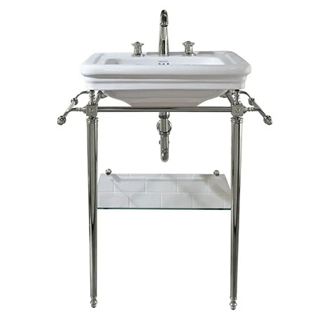 Imperial Etoile ceramic ware is a collection with exceptional presence and strength of character. This 605mm Medium Basin and Polished Nickel Basin Stand features a Victorian inspired design with rounded corners to provide a smooth and subtle variation on a classic look. The luxury Polished Nickel basin stand features a glass shelf and a towel rail either side offering practical storage. All Imperial ceramic ware is made in Britain from clay sourced in Cheshire.