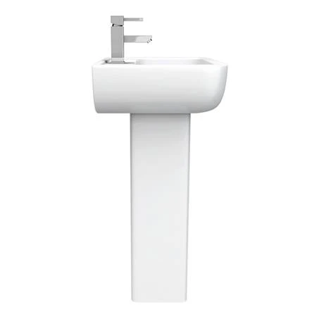 The minimalist Pro 600 modern short projection 1 tap hole basin and pedestal, it’s contemporary elegant soft lines and compact size make it ideal for smaller bathrooms and en-suites; made from high grade ceramic with a smooth cool white finish. The 550mm wide basin only projects from the wall by 410mm. Comes supplied with a full pedestal.