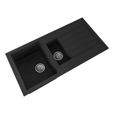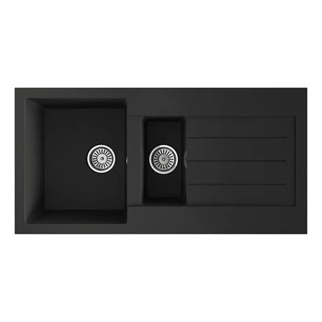 The Venice composite kitchen sink range are constructed from pressed material that is stain, scratch and impact resistant as well as being antibacterial. The sinks can withstand high heat temperatures and are easy to maintain and clean. This 1.5 bowl sink comes in a smooth matt black finish and is fully reversible so the drainer can be on the left or right. Comes supplied with chrome basket strainer wastes.Â