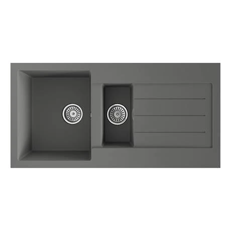 The Venice composite kitchen sink range are constructed from pressed material that is stain, scratch and impact resistant as well as being antibacterial. The sinks can withstand high heat temperatures and are easy to maintain and clean. This 1.5 bowl sink comes in a smooth matt grey finish and is fully reversible so the drainer can be on the left or right. Comes supplied with chrome basket strainer wastes.Â